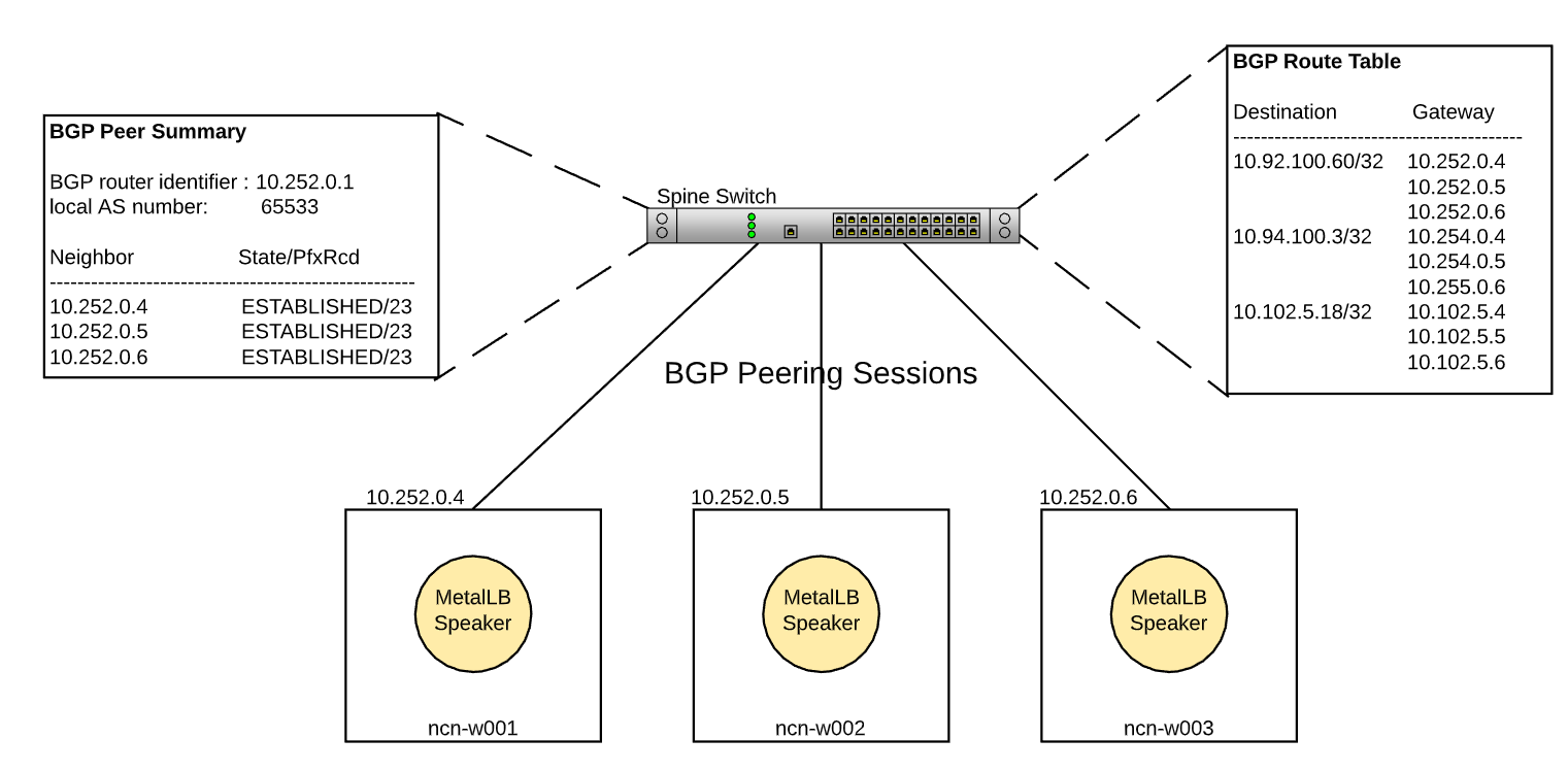 MetalLB can run in either Layer 2 mode or BGP mode for each address pool it manages. BGP mode is used for the NMNLB, HMNLB, and CAN. This enables true load balancing (Layer 2 mode does failover, not load balancing) and allows for a more robust layer 3 configuration for these networks.